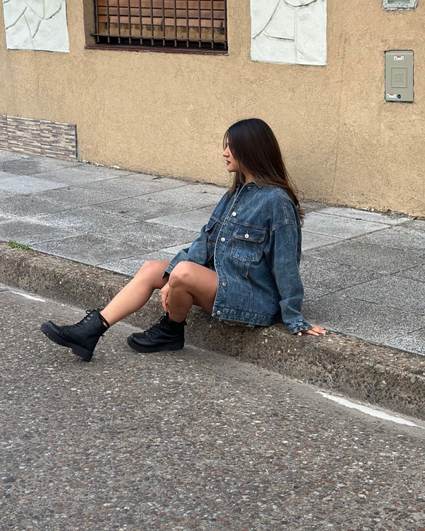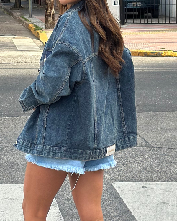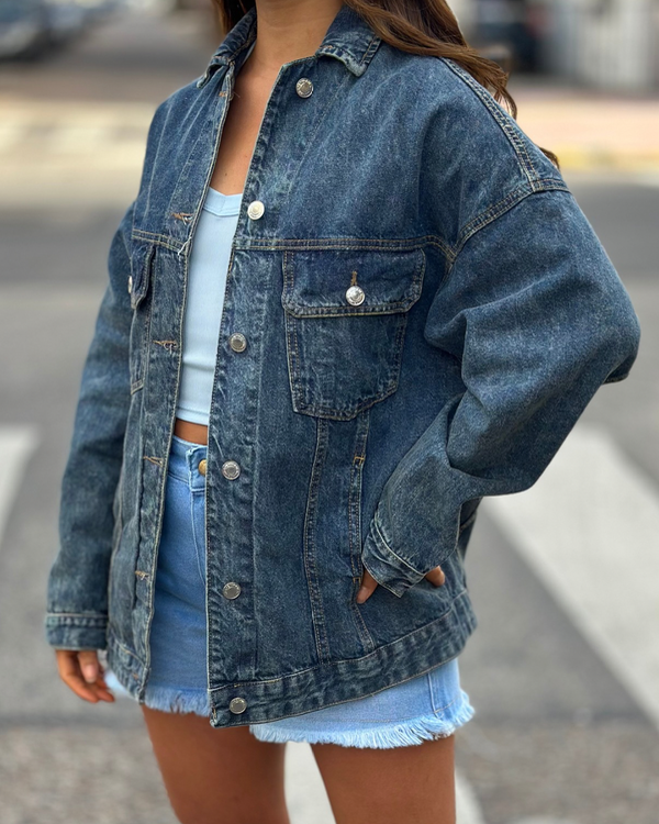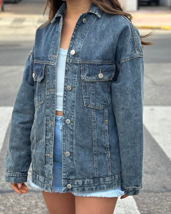 CAMPERA DE JEAN OVERSIZED, DENIM RÍGIDO. COLOR AZUL PETROLEO.